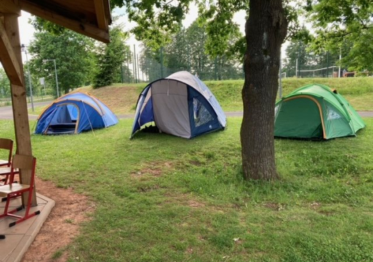 Odpolední sportovní vložka na zahradě školy potvrdila heslo “kdo si hraje, nezlobí” a také, že nám rychleji vytráví. Po postavení stanů jsme se tedy pustili do vaření večeře. Kdo neochutnal pravou gulášovku vařenou v kotlíku nad ohněm, netuší, jaká je to mňamka. A když už bylo roztopeno, opekli jsme i špekáčky a další pochutiny. Vše proloženo zpěvem, samozřejmě. A pak už na kutě, ať je síla na poslední den.
