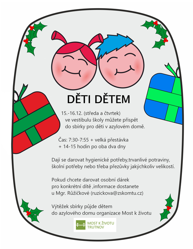 Ve středu a ve čtvrtek 15. a 16. prosince se budou ve vestibulu školy ráno od 7:30 hod, dále o velké přestávce a pak odpoledne od 14 do 15 hodin vybírat hygienické potřeby, trvanlivé potraviny, školní potřeby a přezůvky různých velikostí (potřeby a přezůvky v dobrém stavu mohou být i použité).