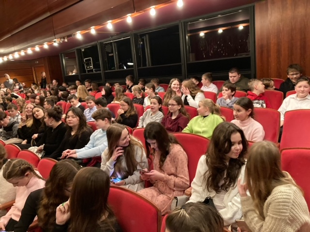 Díky rodičům a učitelům, kteří nám povolili mobily, nám cesta utekla jako voda a po pěším přesunu po studeném Hradci, jsme konečně dorazili do divadla.