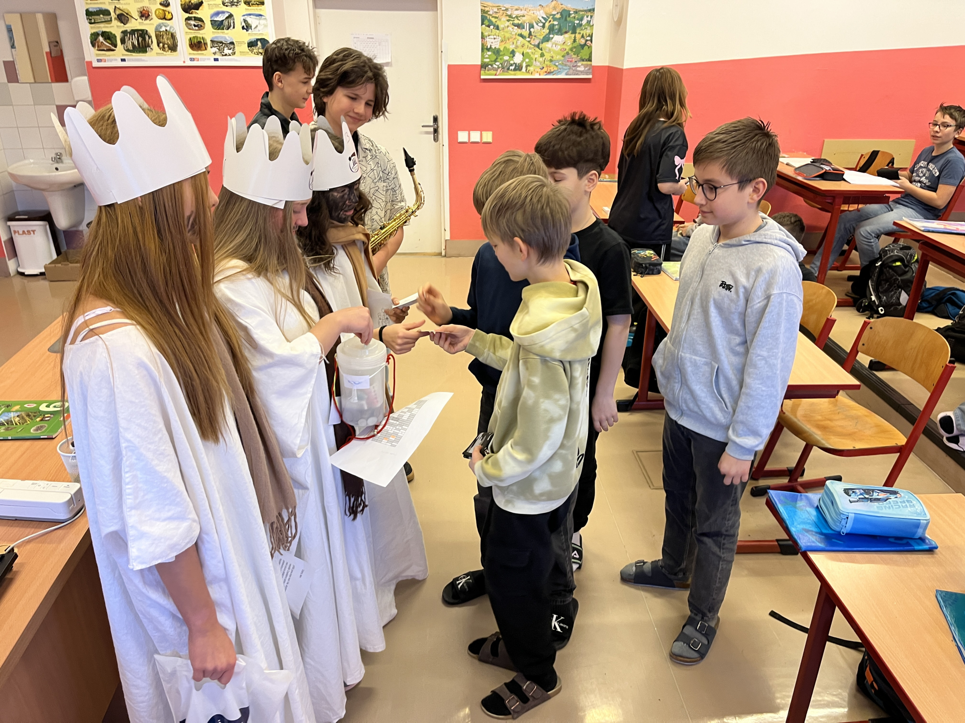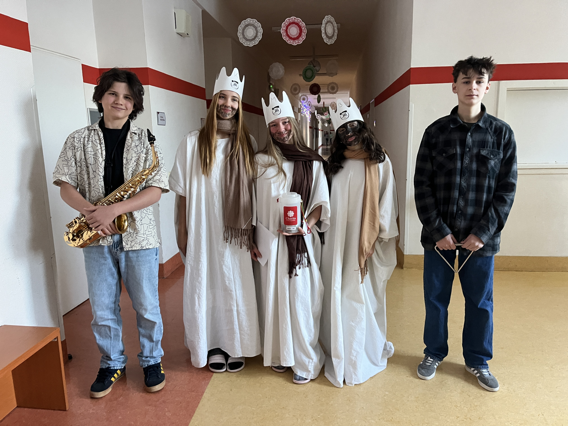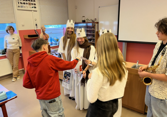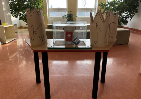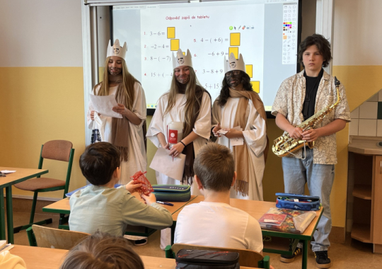 Tři králové prošli naší školou v úterý 6. ledna 2026. Do Tříkrálové pokladničky, která byla vystavena ve vestibulu školy, bylo možné přispívat do 14. ledna 2026, kdy sbírka oficiálně skončila.