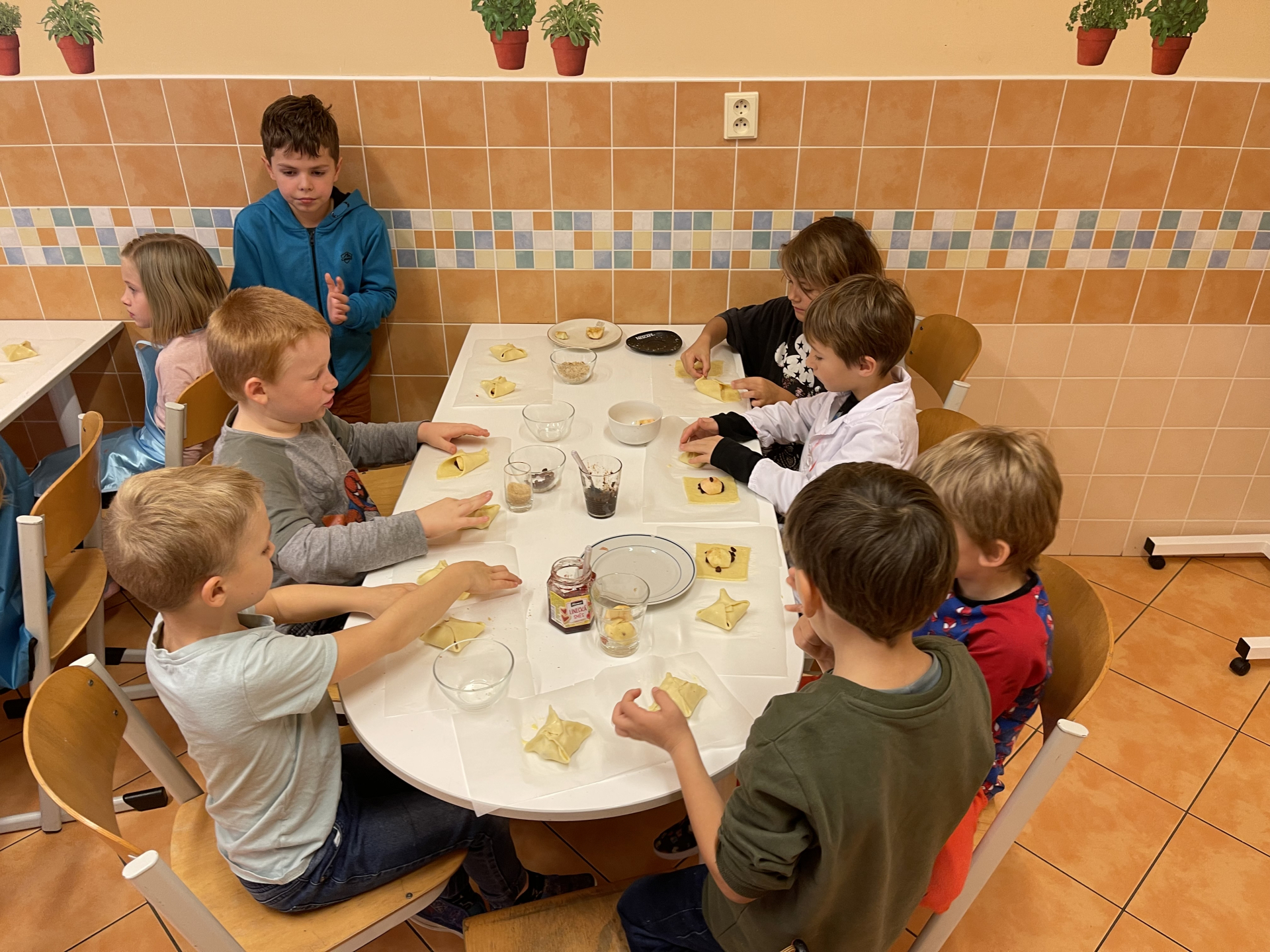Vyzkoušeli si loupání a krájení jablíček. Koláčky si naplnili podle své chuti. Vybírali si z povidel, marmelády, ořechů, kokosu, skořice a hrozinek. Po upečení koláčky ochutnali a také odnesli ochutnat domů.