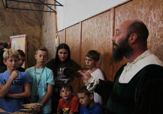 Po pěti letech jsme do naší školy opět pozvali agenturu Pernštejni, kteří k nám přijeli s výukovým programem o Leonardu da Vincim. Akce se nakonec zúčastnily od 9 hodin 4. a 5. ročníky a od 11 hodin 6. a 7. ročníky. Pořad se skládal ze dvou částí, v první půlhodině měli žáci možnost vidět hrané scénky o Leonardově životě a díle. Druhá část byla interaktivní – po obvodu tělocvičny děti prohlížely reprodukce známých výtvarných děl mistra Leonarda a modely některých vynálezů. Děti si řadu z nich mohly osahat a vyzkoušet jejich funkčnost. Zaujala je např. ornitoptéra /létací stroj/, excentrická vačka /automatické kladivo/, víceranná puška, tank, soustava kladek, ozubená kola, samosvorný most, ale také přístroj na měření síly větru či helikoptéra. Některé třídy poté využily při další hodině pracovní listy, v nichž se hezky ukázalo, kolik si toho žáci z představení odnesli. Myslím, že vystoupení bylo příjemným zpestřením začátku našeho školního roku.