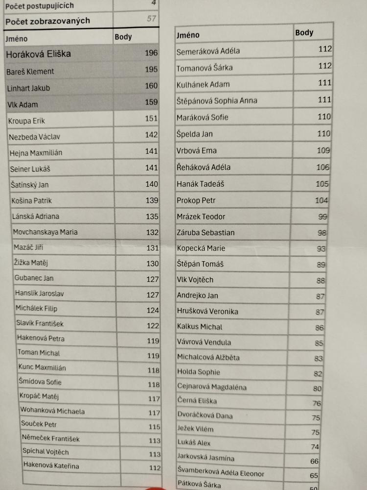 V kategorii B (6. - 9. ročník ZŠ a odpovídající ročníky SŠ) se do soutěže zapojilo původně 34064 řešitelů, z toho v Královéhradeckém kraji 2445 řešitelů. Michal byl v základním kole lepší jak 98,55 % dětí v kraji a než 97,65 % v celé republice. Do celostátního kola sice nepostoupil, ale i tak je to velmi dobrý výsledek.  Michalovi děkujeme ze reprezentaci Komendy a jeho rodičům za podporu při účasti v kraji.