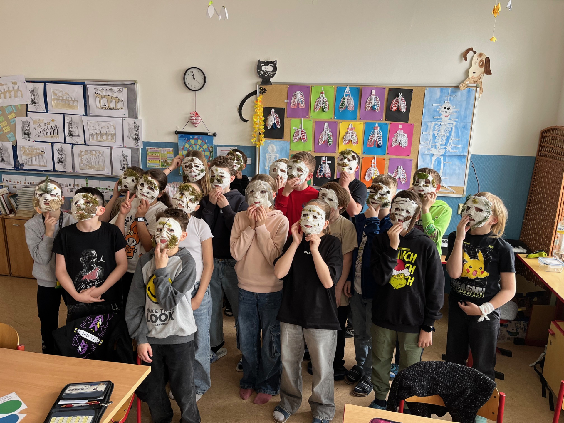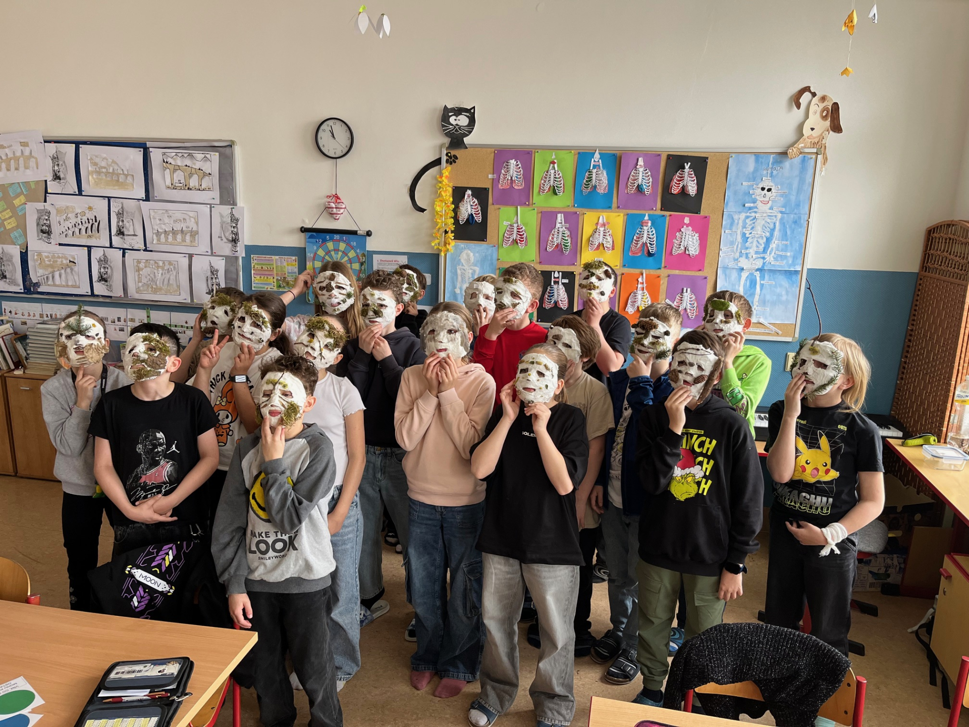 V průběhu měsíce března s žáky v předmětu přírodověda probíráme lidské tělo. Paní učitelku napadlo vytvořit sádrové masky podle tvaru obličeje každého žáka. Každému žákovi jsme nalepili na obličej obvaz namočený v sádře a tvořili odlitky obličejů. Poté jsme jednu hodinu výuky strávili venku, kde si žáci nasbírali různé přírodniny a ozdobili si jimi masky. Byla to velká zábava a děti takové aktivity moc baví.