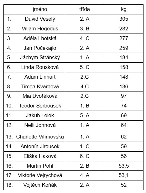 V letošním roce byla úroda kaštanů výborná. Svědčí o tom i množství, které žáci do školy přinesli. Celkem nasbírali 3 854 kg. Soutěž vyhrál David Veselý ze 2. A. Nasbíral rekordních 305 kg. Další pořadí v soutěži zobrazuje tabulka.